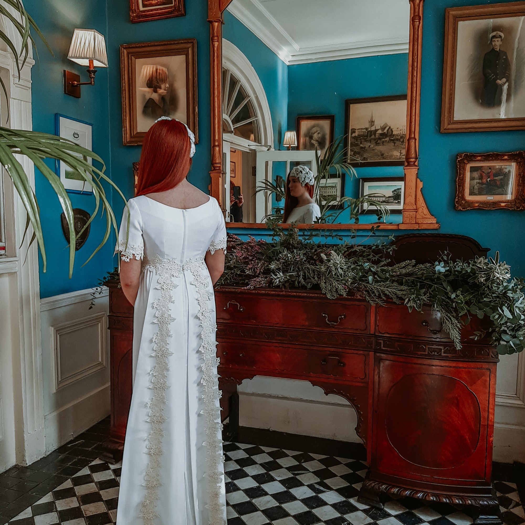 She has 2 train panels which are embellished with beautifully detailed floral lace which continues along the waist panel and on to the sleeves.